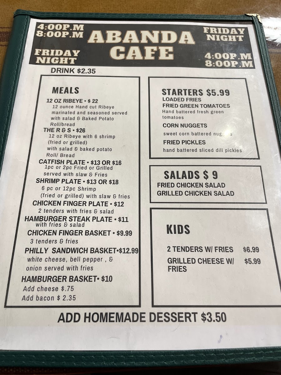 Welcome to Abanda Cafe and Bake Shop, a charming gem nestled in the heart of Wadley, Alabama! This delightful cafe is not just a dining spot; it’s a warm invitation to indulge in homemade goodness that embodies the spirit of Southern cooking. From the moment you step inside, you’ll be greeted by friendly staff and the homey aroma of freshly baked goods that instantly make you feel at home.